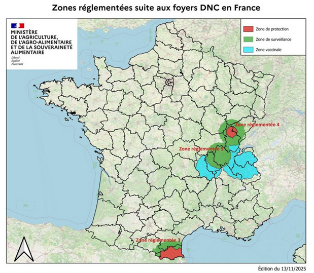 - Au total : 101 foyers ont été confirmés dont 3 dans l’Ain, 32 en Savoie, 44 en Haute-Savoie, 1 dans le Rhône, 7 dans le Jura et 14 dans les Pyrénées-Orientales (6 départements, 66 élevages),