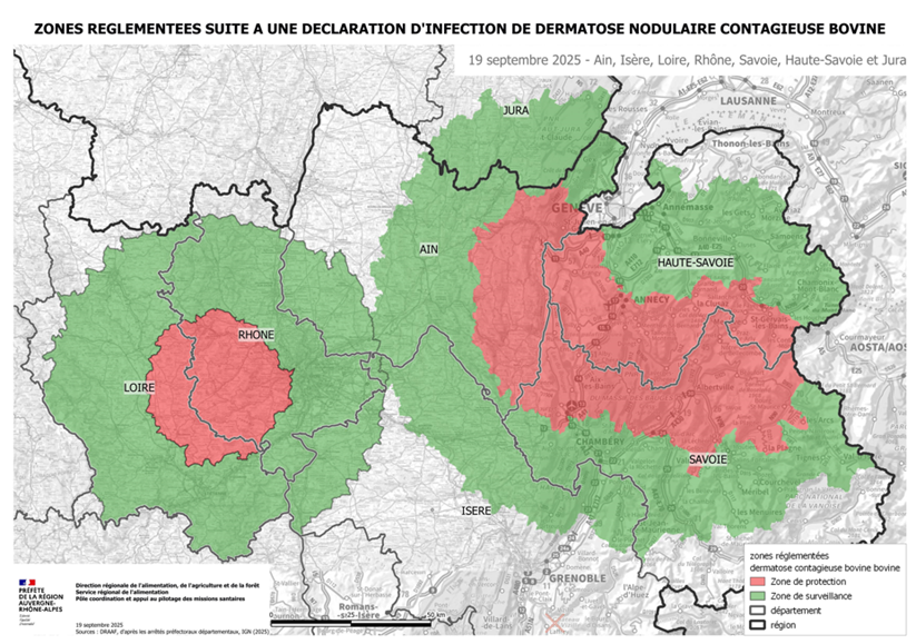 Suite à la confirmation d’un cas de DNC dans le Rhone, voici la nouvelle zone réglementée :