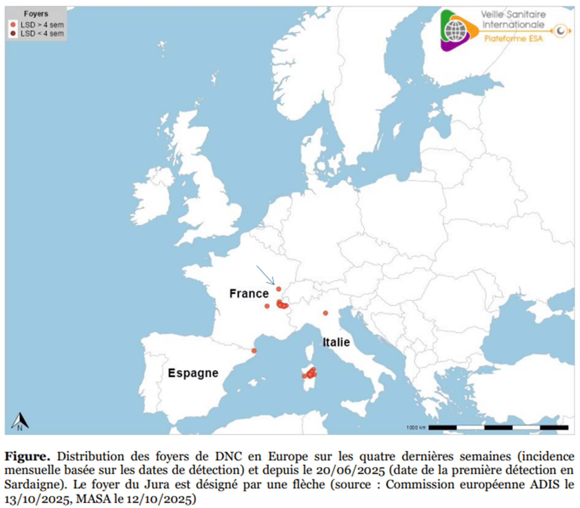 Un foyer de dermatose nodulaire contagieuse bovine (DNC) a été détecté dans le Jura en zone indemne le 11/10/2025 dans un élevage de 93 bovins.