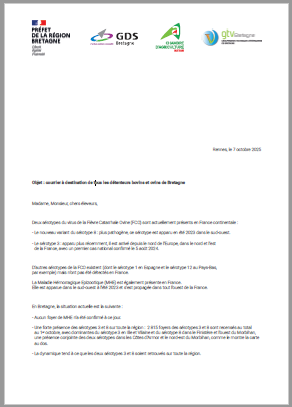 Nous vous invitons à consulter ce courrier en cliquant sur ce lien ou l’image ci-dessous, et à échanger avec votre vétérinaire traitant pour toute question relative à la vaccination ou à la gestion sanitaire de votre élevage.