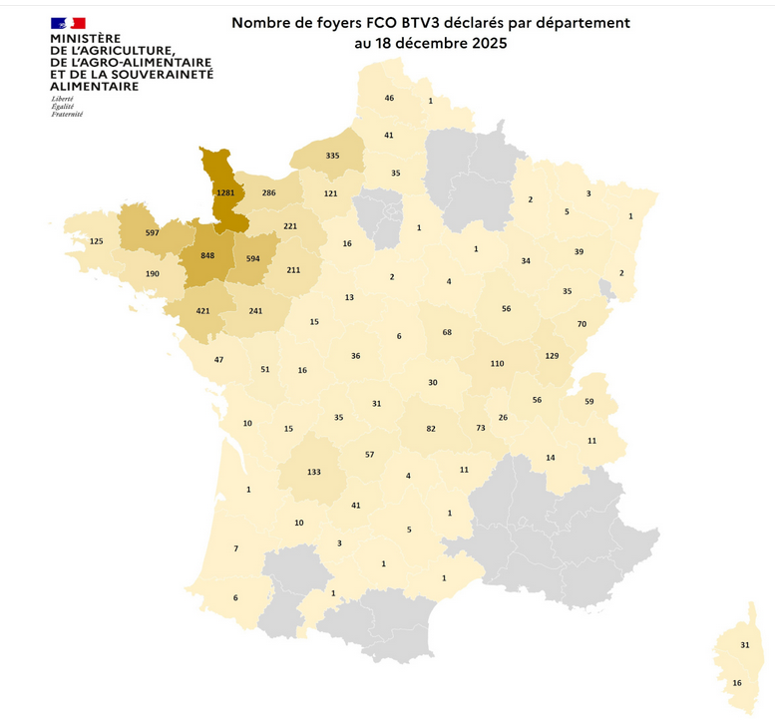 Entre le 1er juin et le 18 décembre 2025, 7 127 foyers de FCO, sérotype 3, ont été recensés en France.