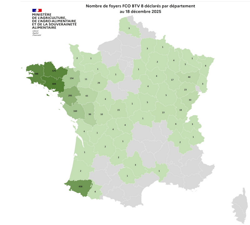 Entre le 1er juin et le 18 décembre 2025, 3 251 foyers de FCO, sérotype 8, ont été recensés en France.