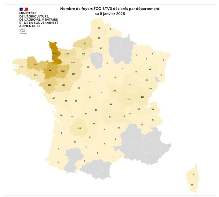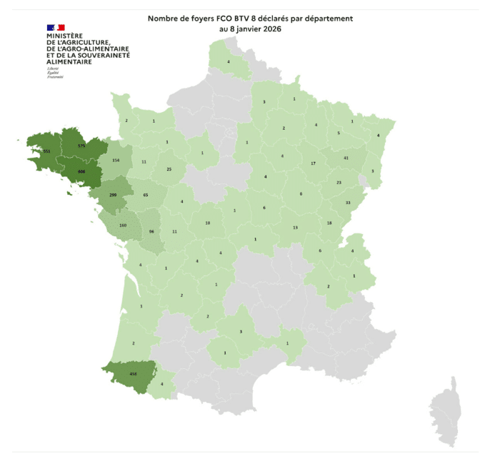 Entre le 1er juin et le 8 janvier 2026, 3 276 foyers de FCO, sérotype 8, ont été recensés en France.
