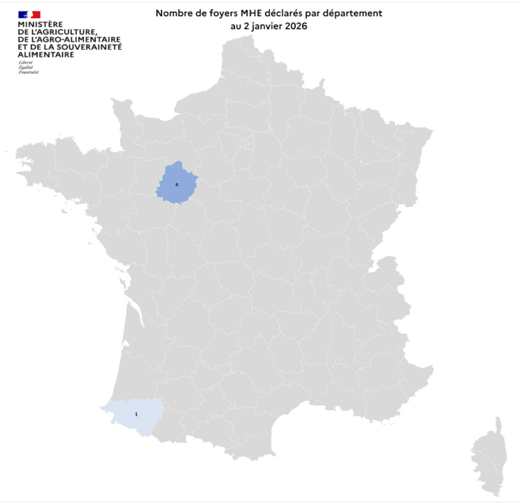 Entre le 1er juin et le 8 janvier 2026, 5 foyers de maladie hémorragique épizootique (MHE) ont été recensés en France.
