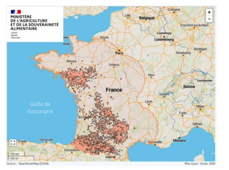 Vous pouvez suivre l’évolution des zones régulées sur le site GDS Bretagne en actualité ou sur les pages dédiées du Ministère de l’agriculture (cliquez pour ouvrir la page web) : Suivi de situation de la MHE